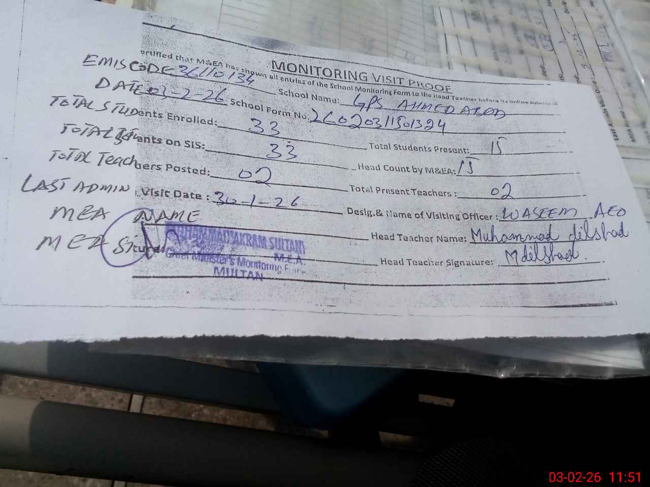 | Attendance Register | Head Teacher | MEA with School | Visit Proof |