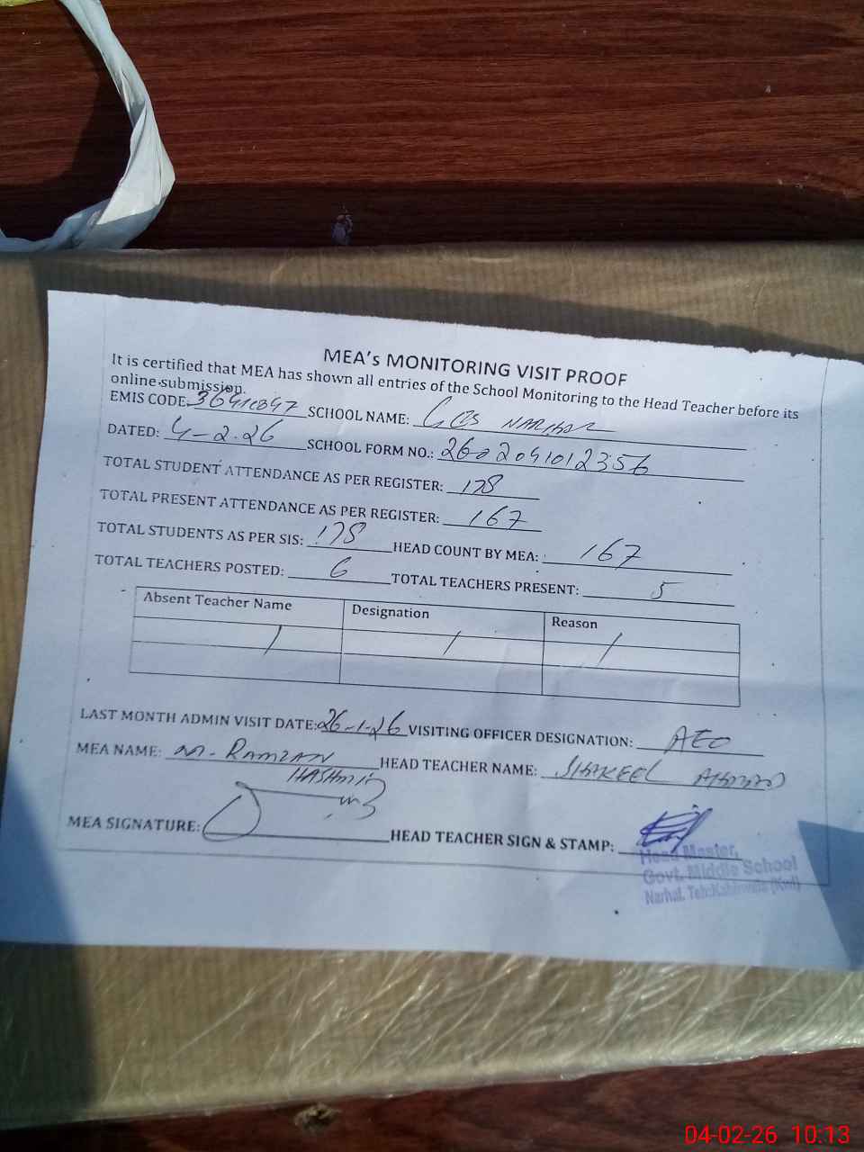 | Attendance Register | Head Teacher | MEA with School | Visit Proof |