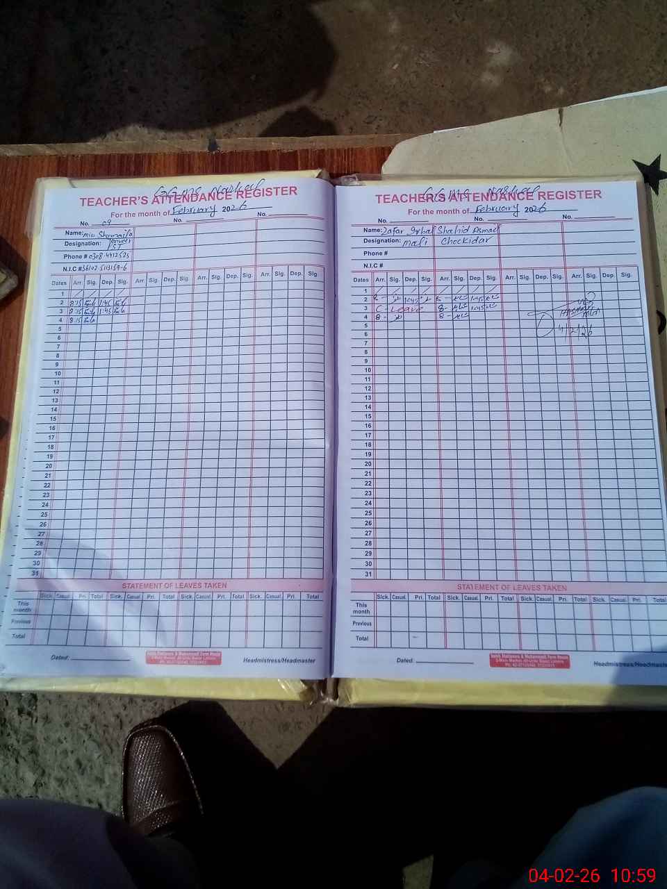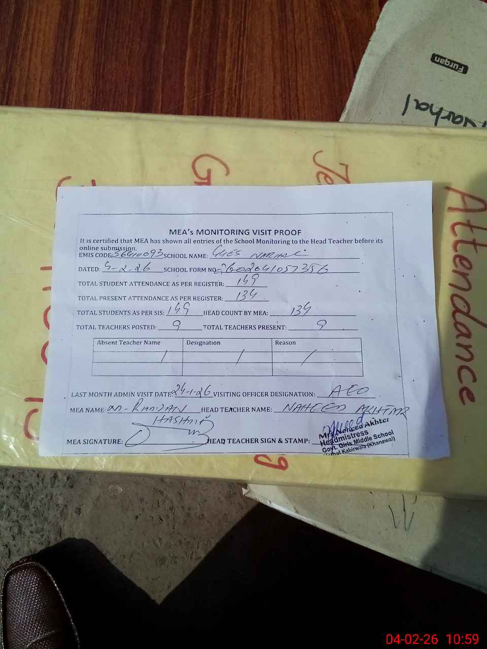 | Attendance Register | Head Teacher | MEA with School | Visit Proof |
