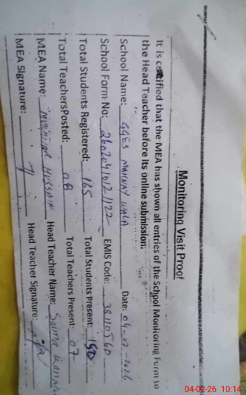 | Certified that this School was Inspected by the Undersigned MEA/DMO Today and the Information Stated Above is as Per Record. | |||||
