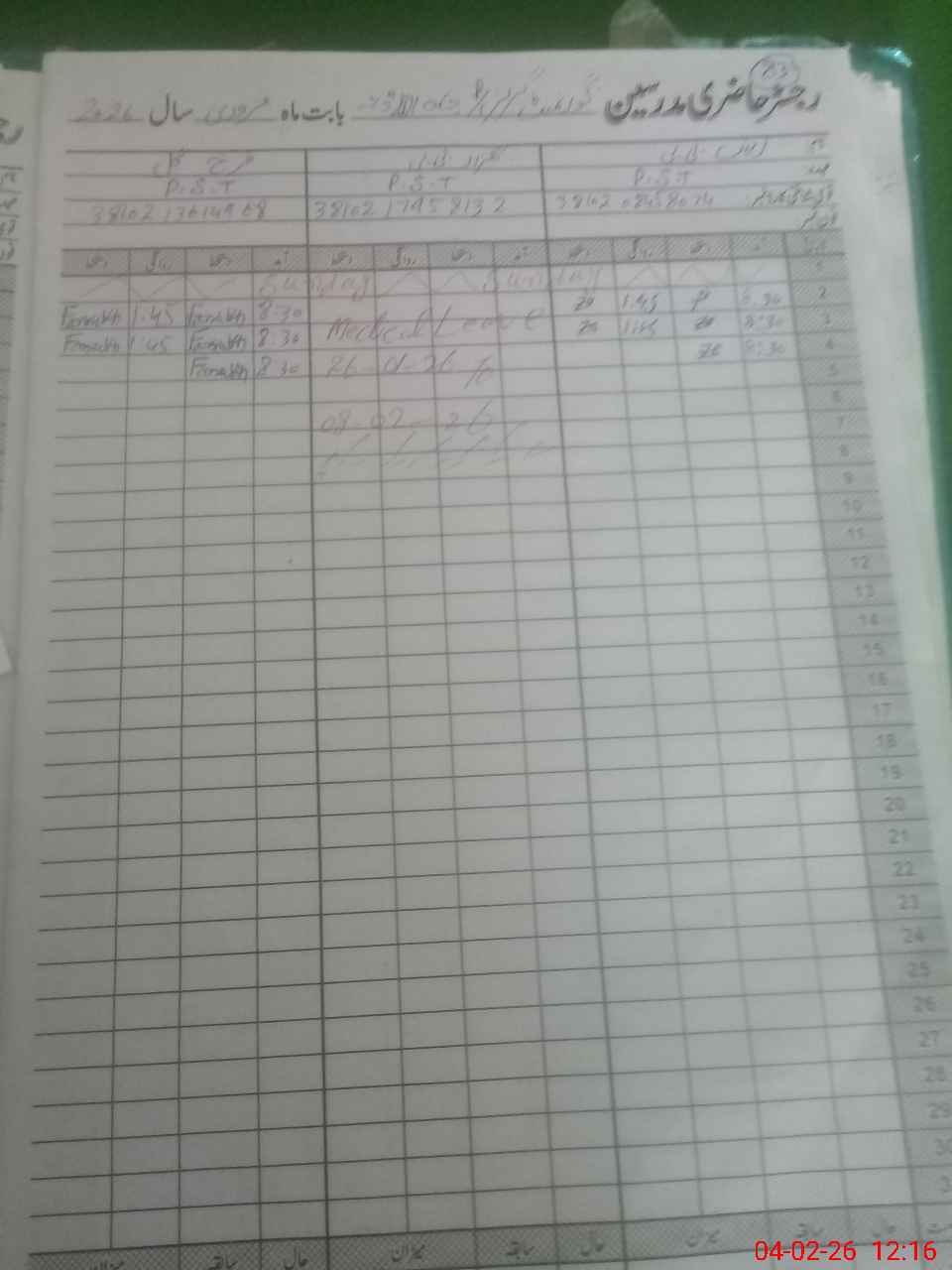 | CNIC | Full Name | Designation | R/C | Absence During Last Calender Month |