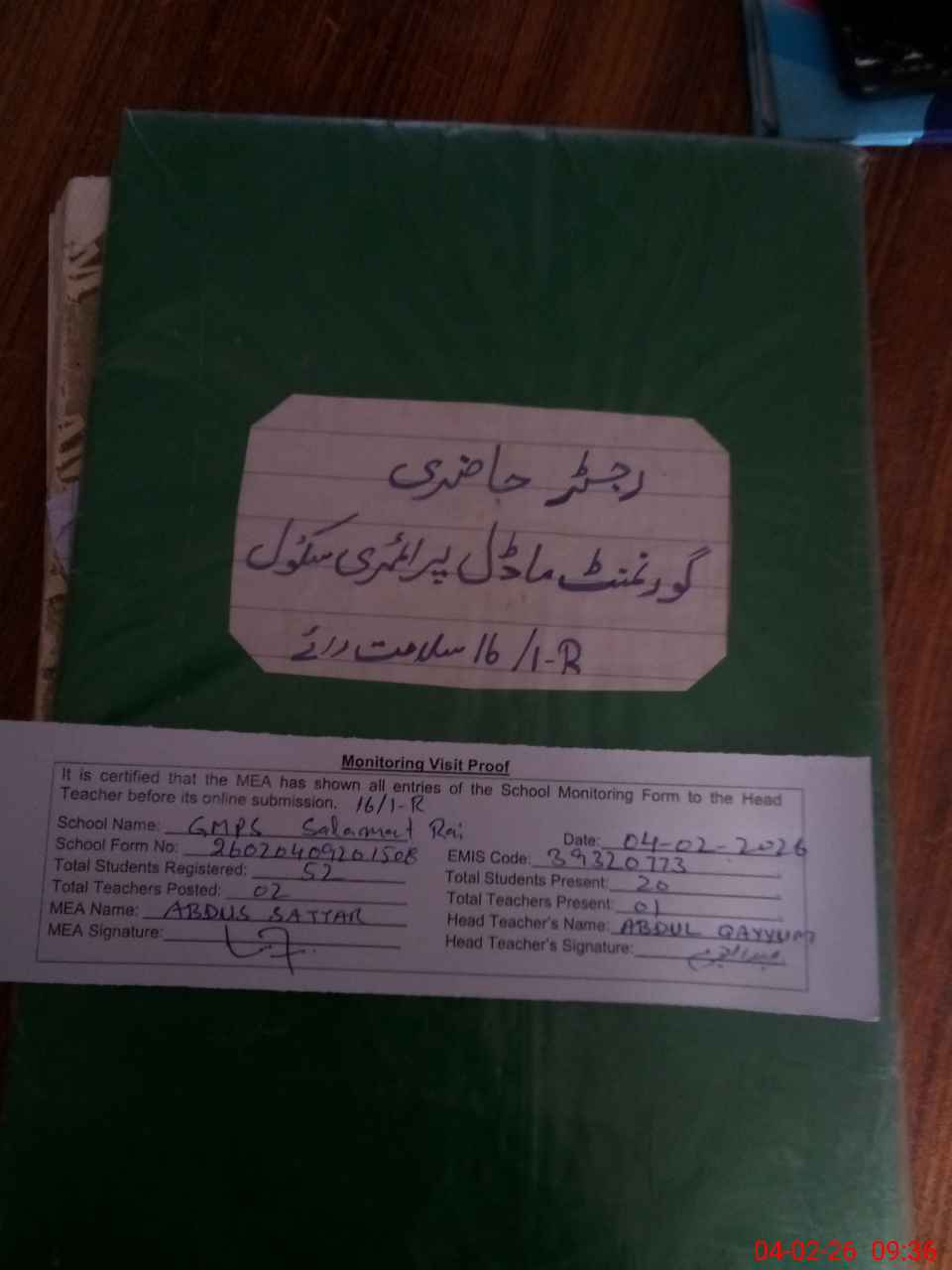 | EMIS Code: 39320773 | Name of School: GMPS CHAK NO. 16/1-R SLAMAT RAI | |||