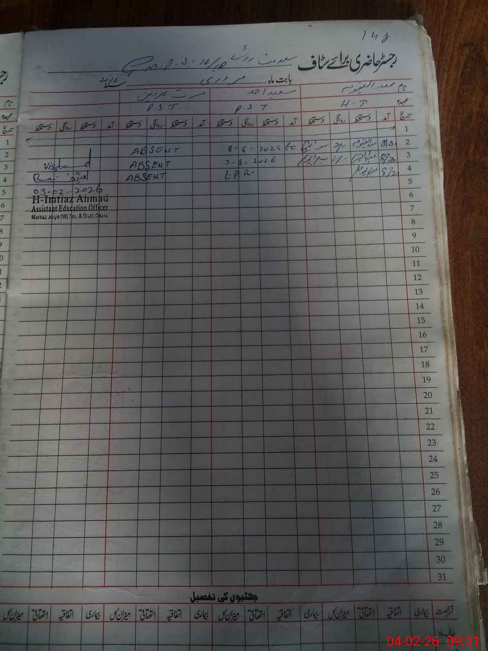 | Remarks (Use Separate Page if Required): Musarat Parveen PST found absent Since 1 September 2025 | |||||