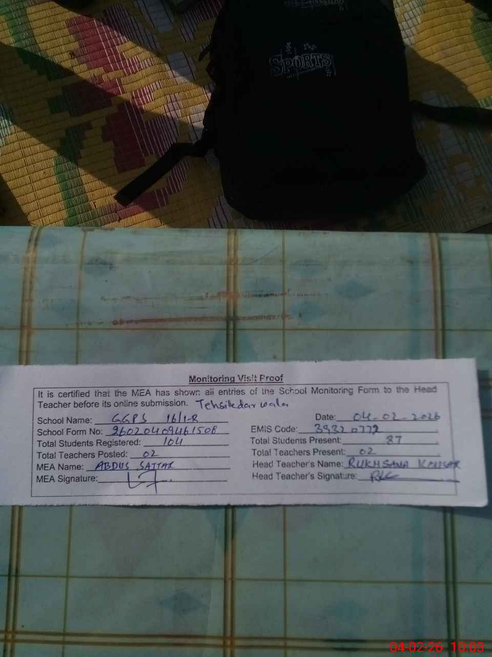 | Attendance Register | Head Teacher | MEA with School | Visit Proof |