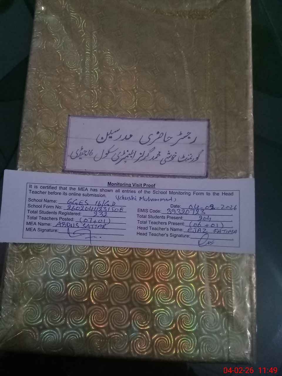| EMIS Code: 39320723 | Name of School: GGES KHUSHI MUHAMMAD 16/G.D | |||