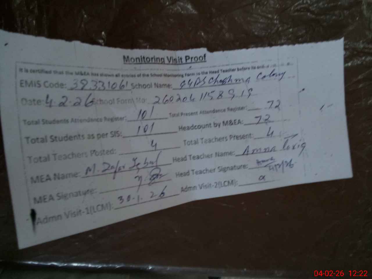 | Attendance Register | Head Teacher | MEA with School | Visit Proof |