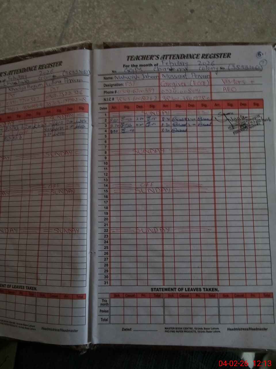 | CNIC | Full Name | Designation | R/C | Absence During Last Calender Month |