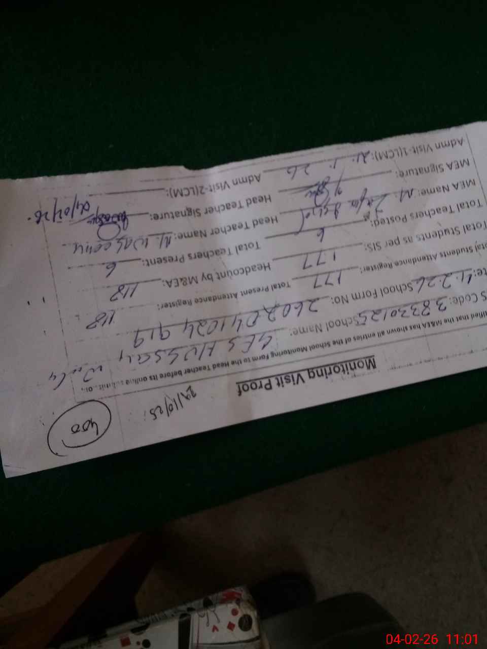 | Attendance Register | Head Teacher | MEA with School | Visit Proof |
