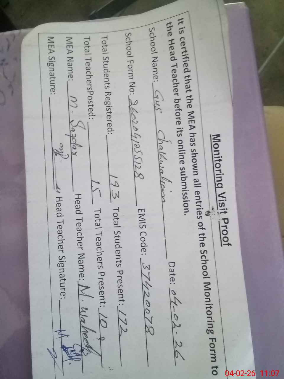 | EMIS Code: 37420078 | Name of School: GHS CHAKWALIAN | |||
