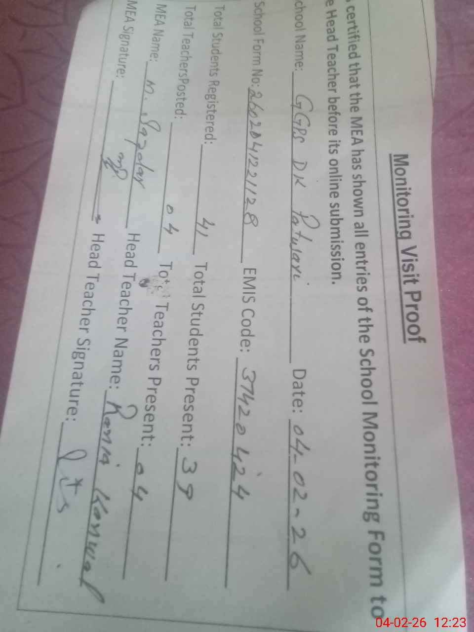 | EMIS Code: 37420424 | Name of School: GGPS DHOK PATWARI | |||