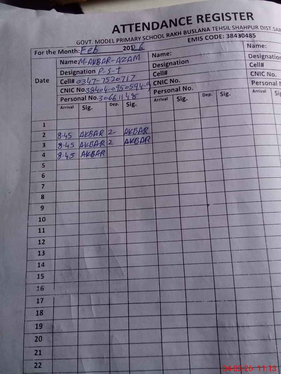 | CNIC | Full Name | Designation | R/C | Absence During Last Calender Month |