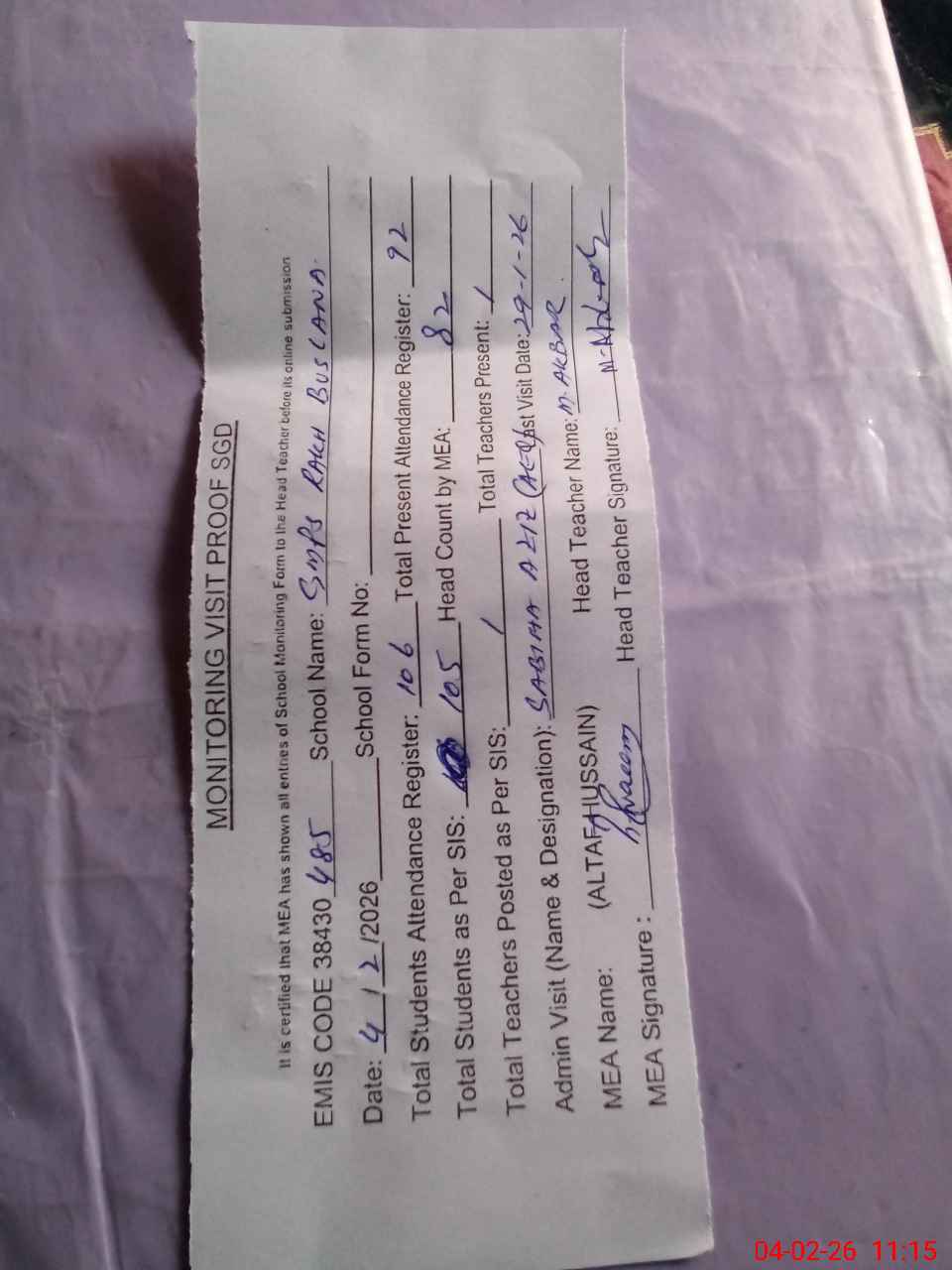 | Attendance Register | Head Teacher | MEA with School | Visit Proof |