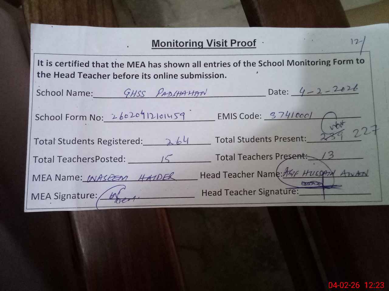| Attendance Register | Head Teacher | MEA with School | Visit Proof |