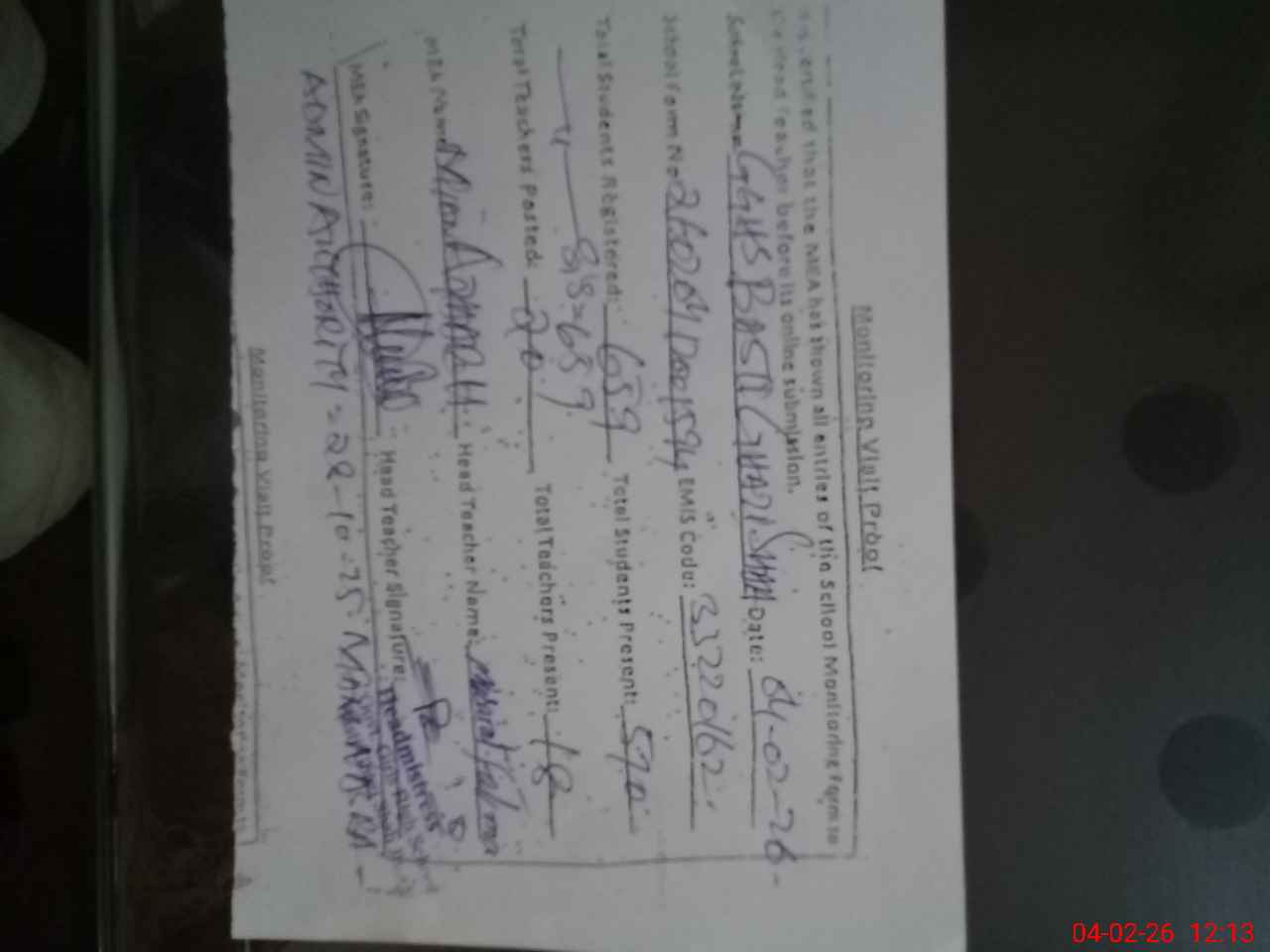 | Attendance Register | Head Teacher | MEA with School | Visit Proof |
