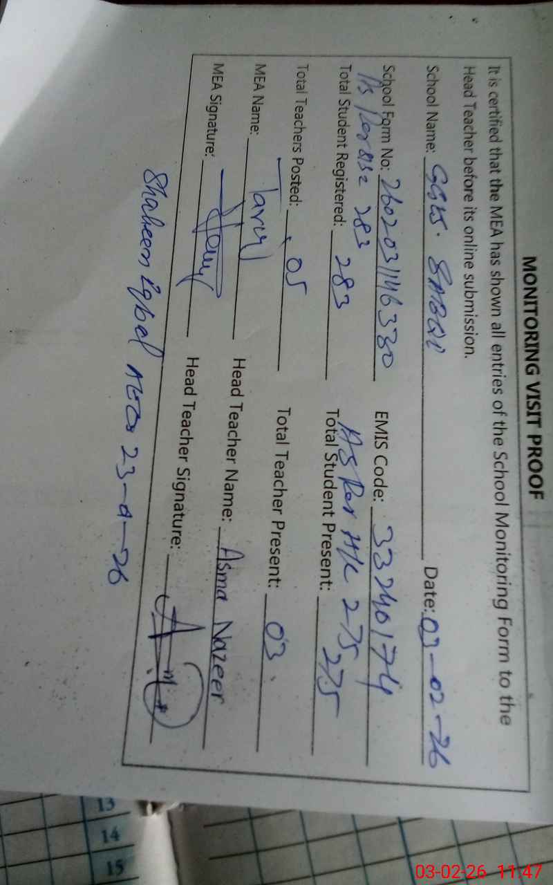 | Attendance Register | Head Teacher | MEA with School | Visit Proof |