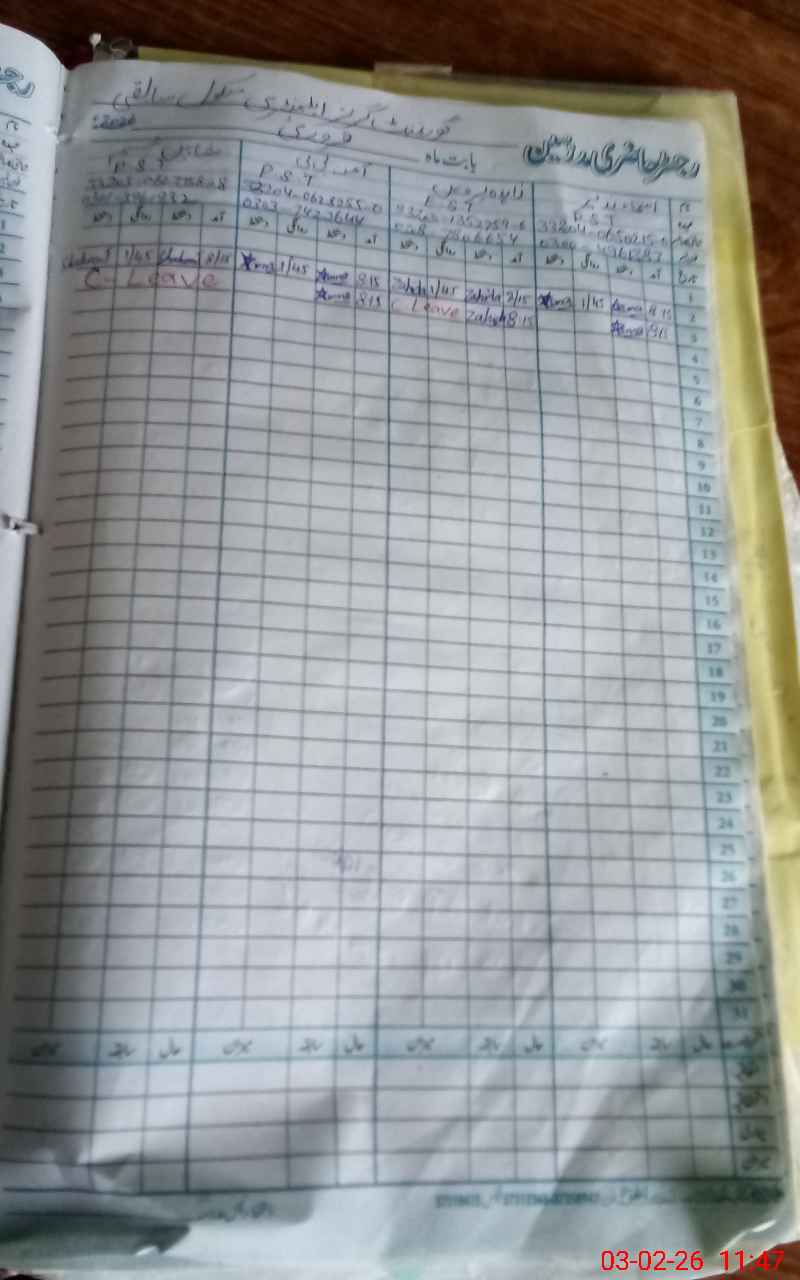 | CNIC | Full Name | Designation | R/C | Absence During Last Calender Month |