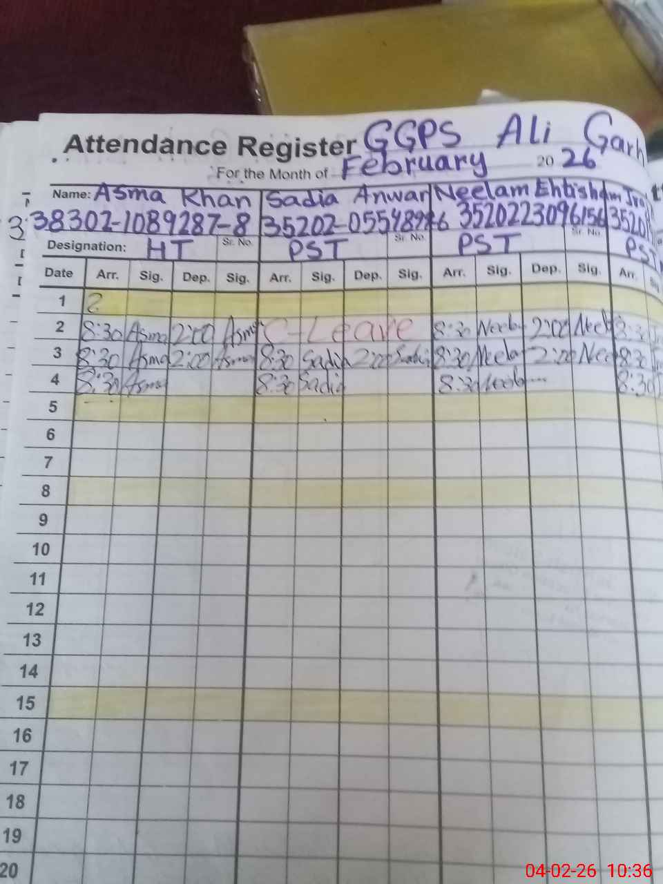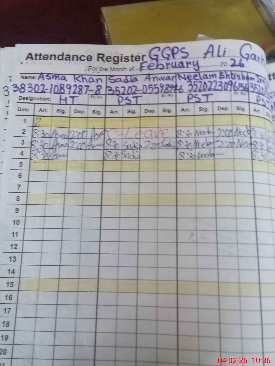 | CNIC | Full Name | Designation | R/C | Absence During Last Calender Month |