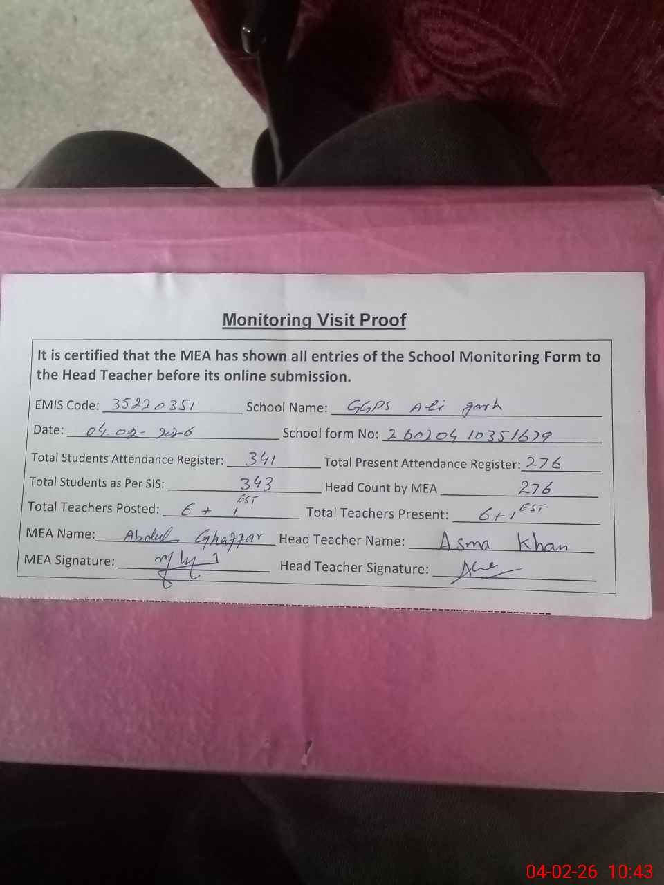 | Attendance Register | Head Teacher | MEA with School | Visit Proof |