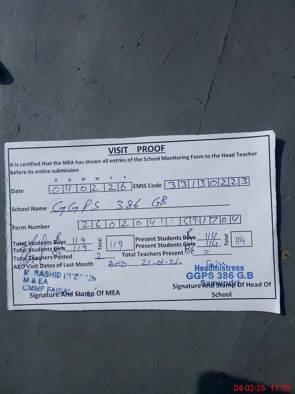 | Attendance Register | Head Teacher | MEA with School | Visit Proof |
