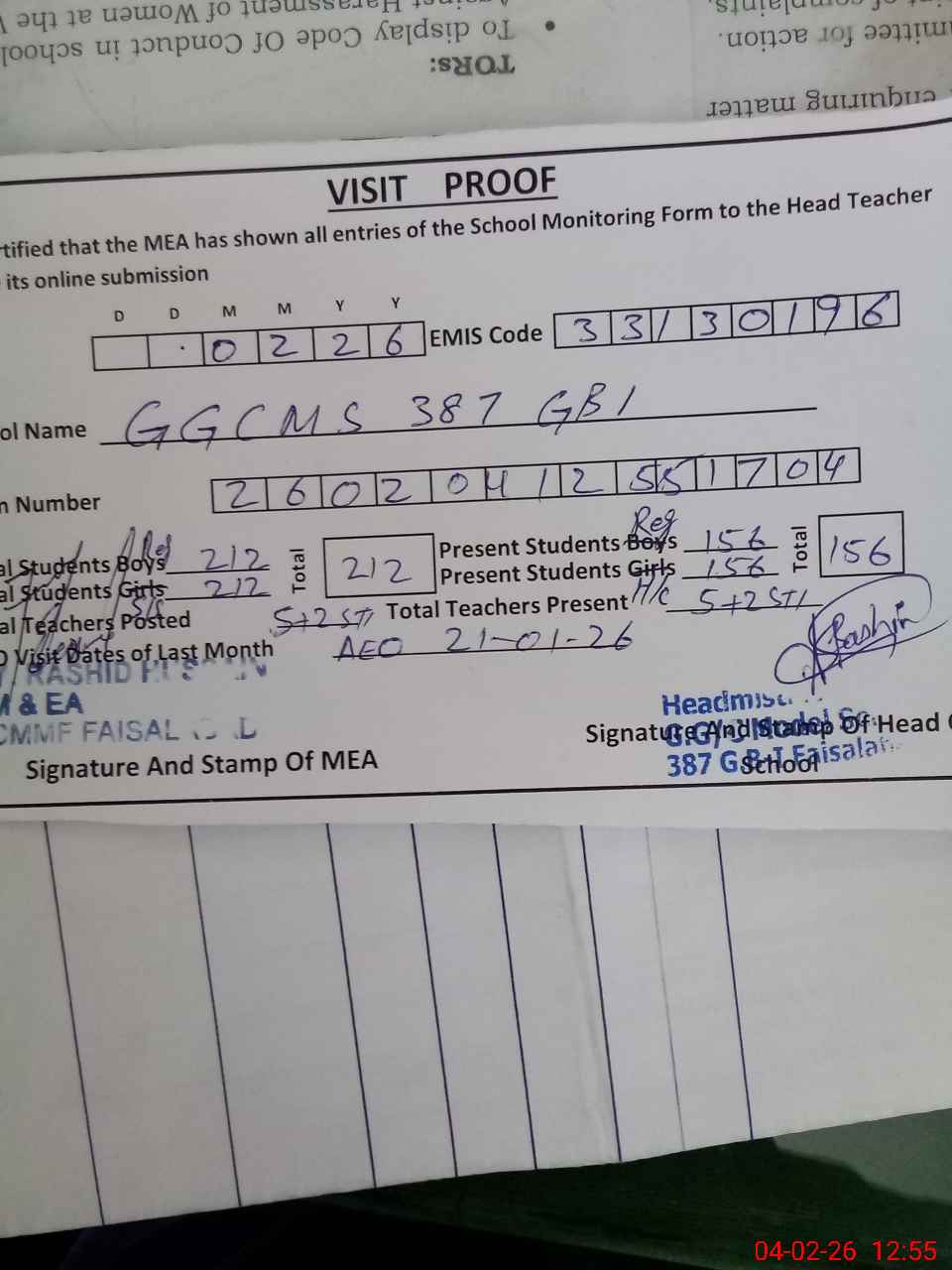 | Attendance Register | Head Teacher | MEA with School | Visit Proof |