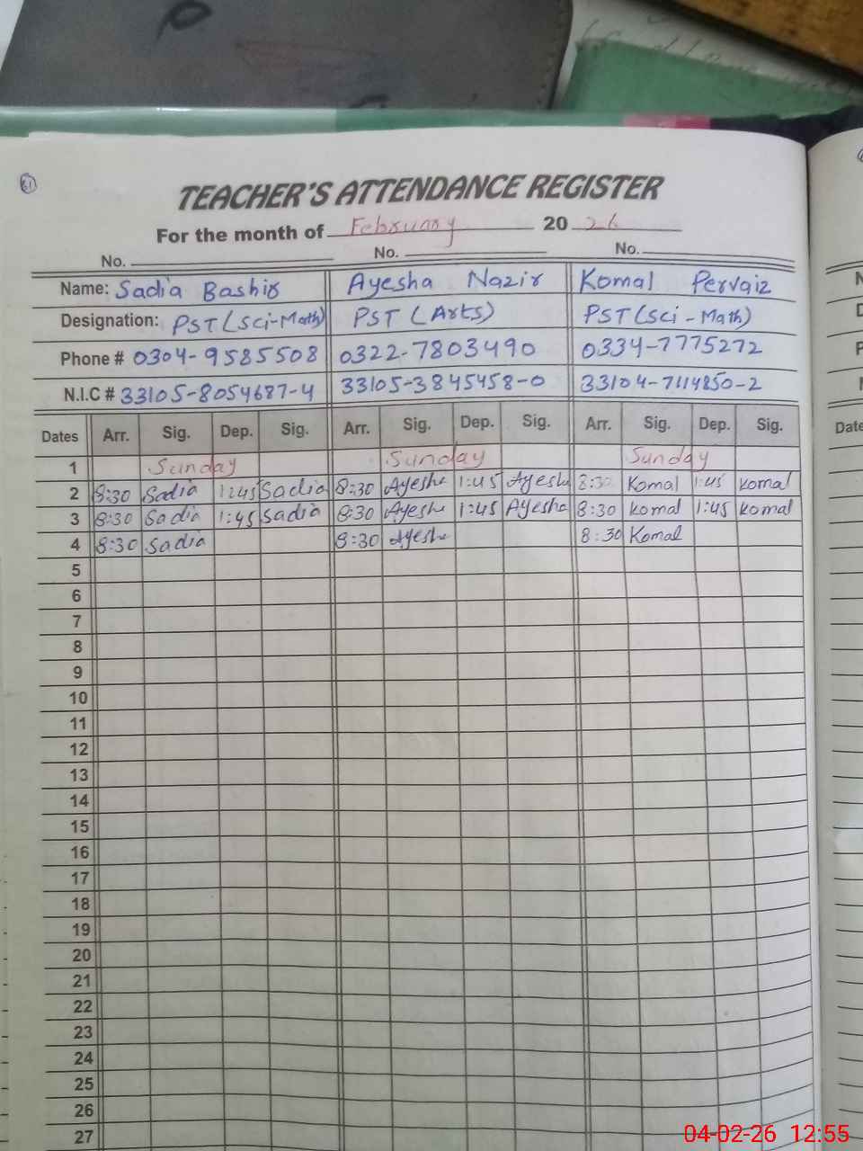 | Name: SA**** BA**** Designation: (School Headmaster's/Headmistress's) PST Phone/Cell Number: 03**** |