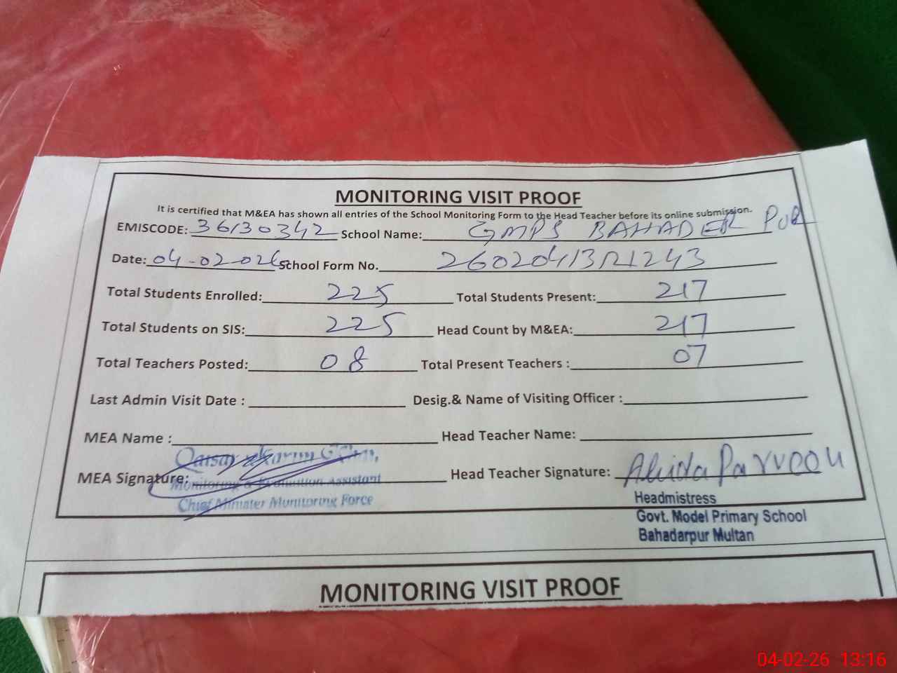 | EMIS Code: 36130342 | Name of School: GMPS BAHADAR PUR NEAR BASTI NAU | |||