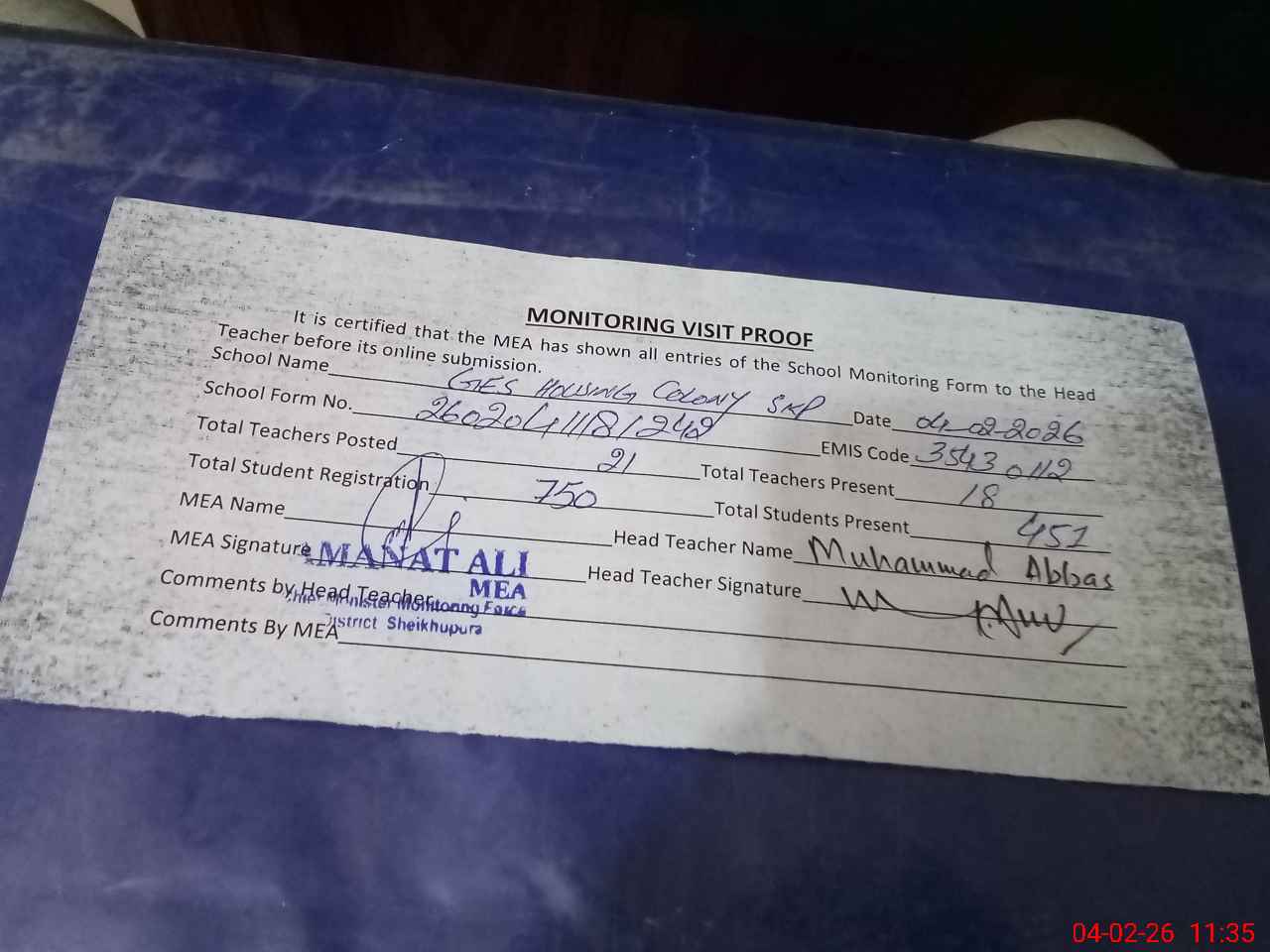 | Attendance Register | Head Teacher | MEA with School | Visit Proof |
