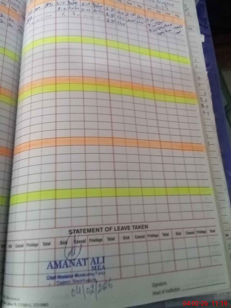 | CNIC | Full Name | Designation | R/C | Absence During Last Calender Month |