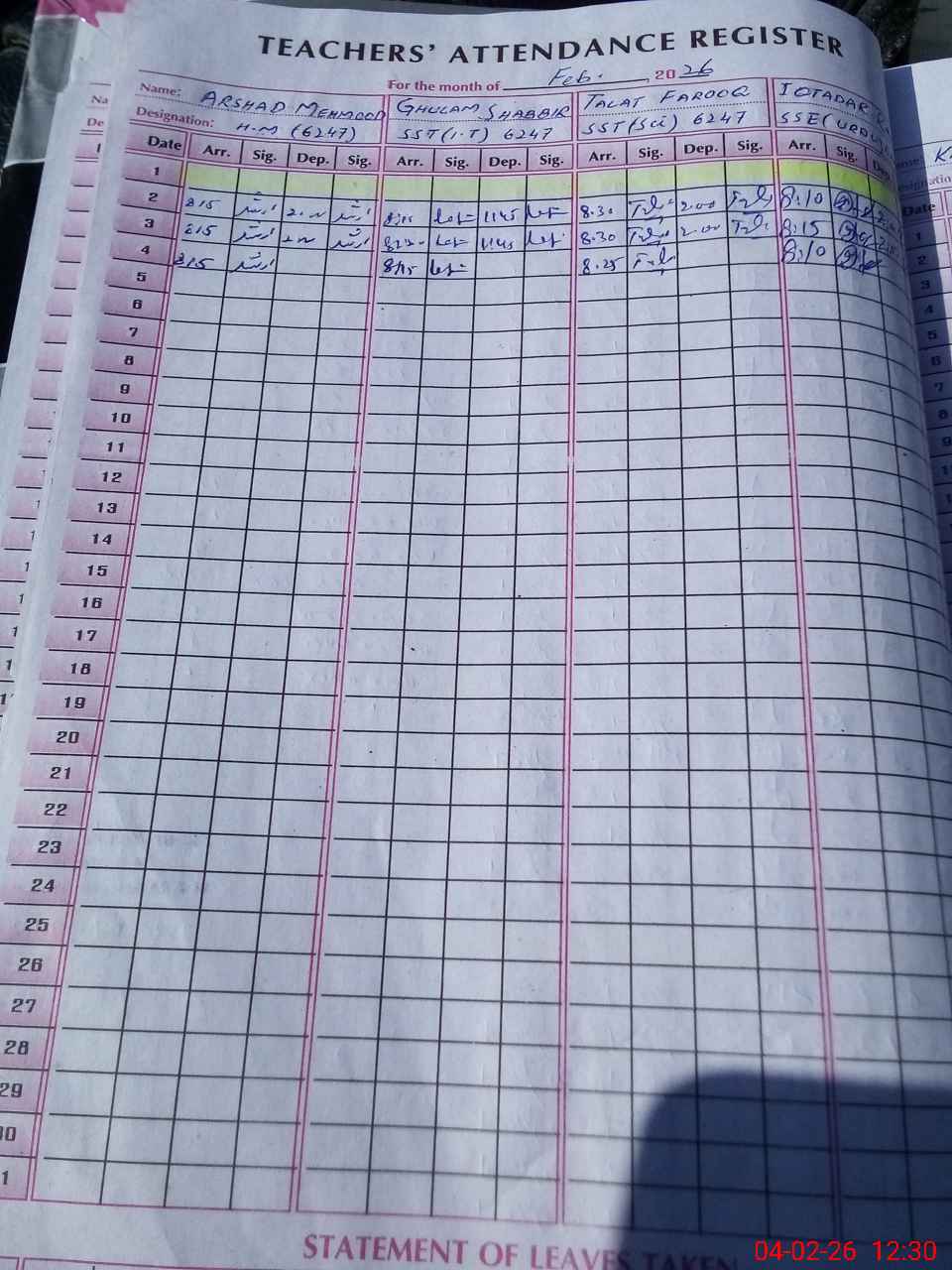 | CNIC | Full Name | Designation | R/C | Absence During Last Calender Month |