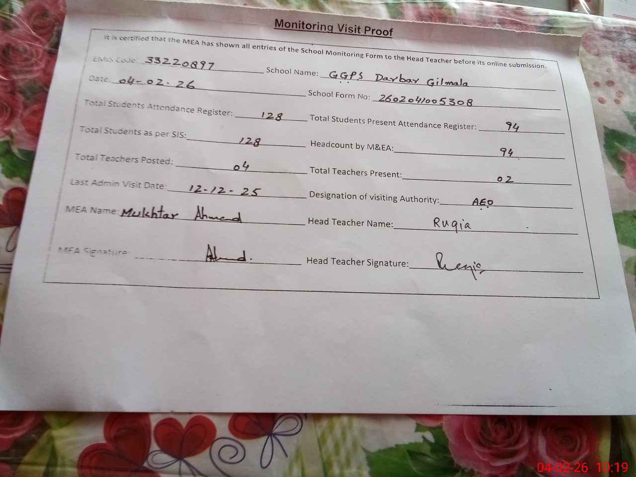 | Attendance Register | Head Teacher | MEA with School | Visit Proof |