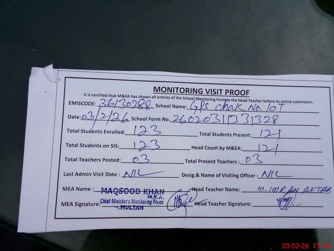 | EMIS Code: 36130288 | Name of School: GPS CHAK NO. 10 T MULTAN | |||