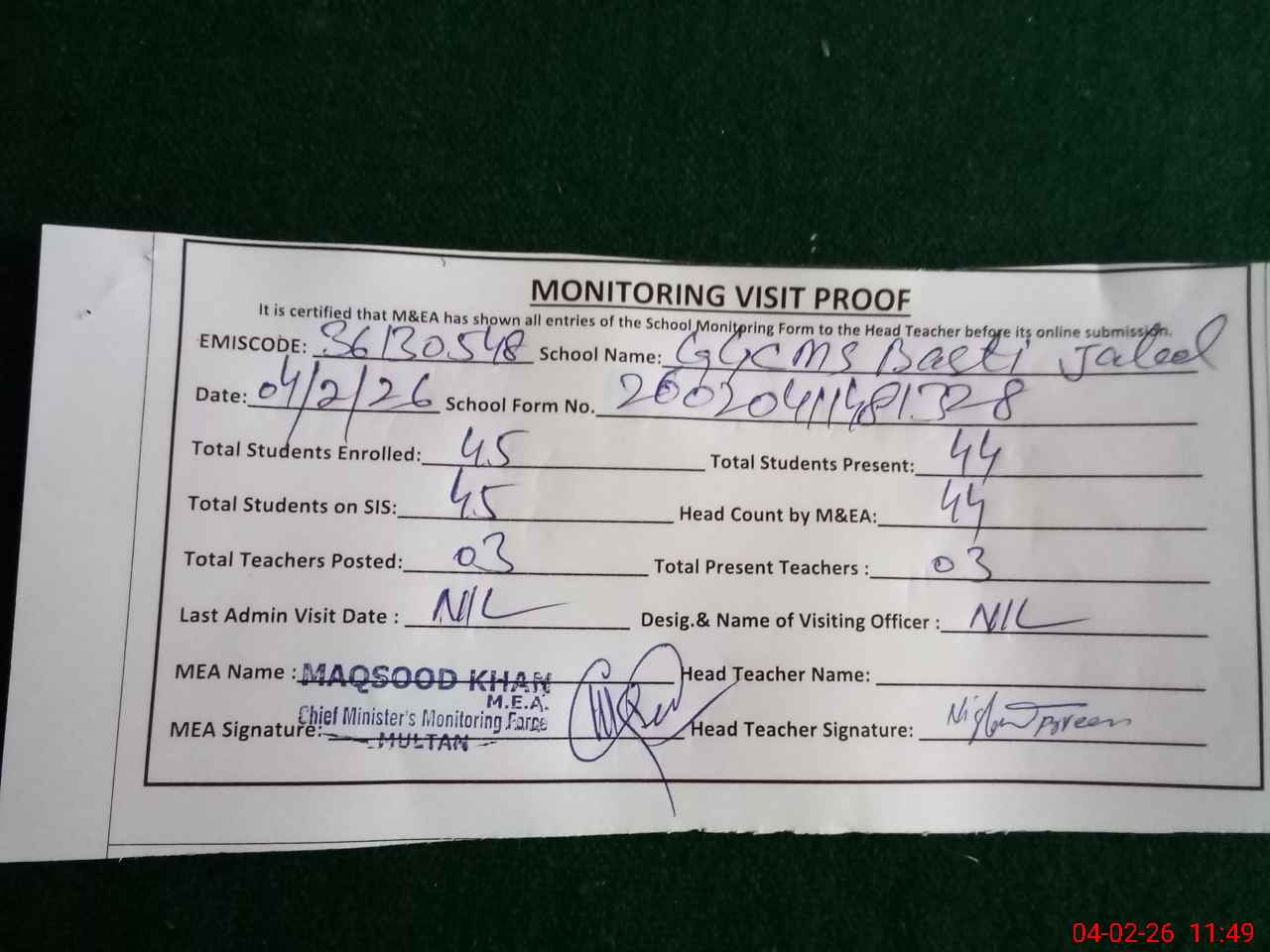 | Attendance Register | Head Teacher | MEA with School | Visit Proof |