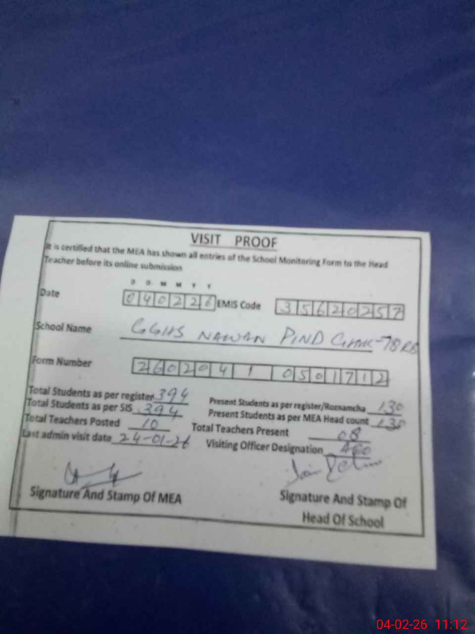 | Attendance Register | Head Teacher | MEA with School | Visit Proof |