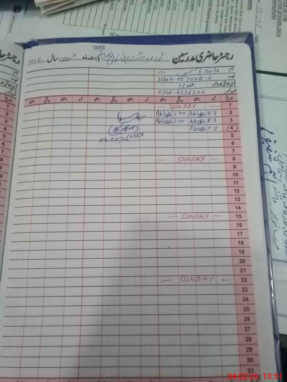 | CNIC | Full Name | Designation | R/C | Absence During Last Calender Month |
