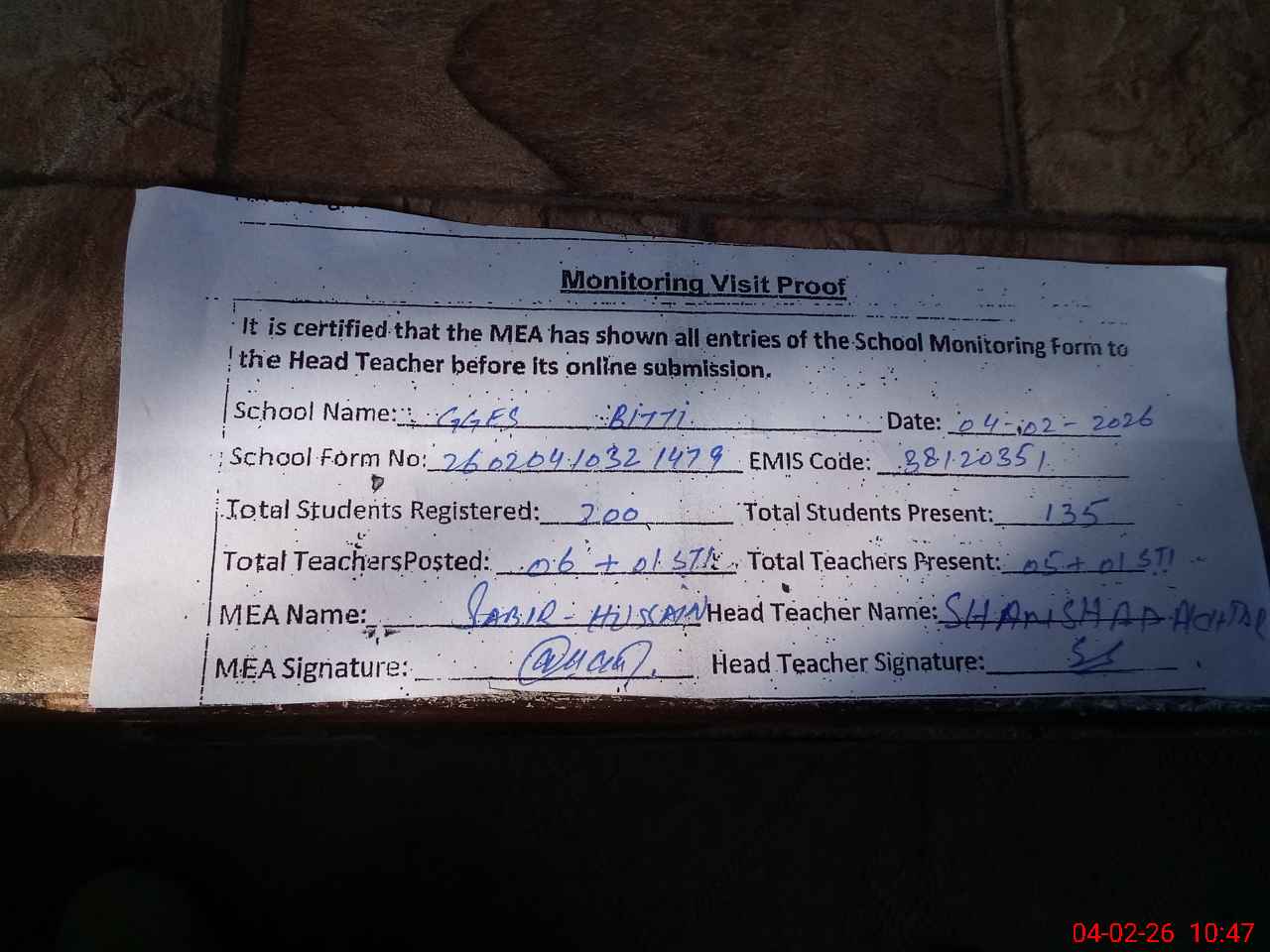 | Attendance Register | Head Teacher | MEA with School | Visit Proof |