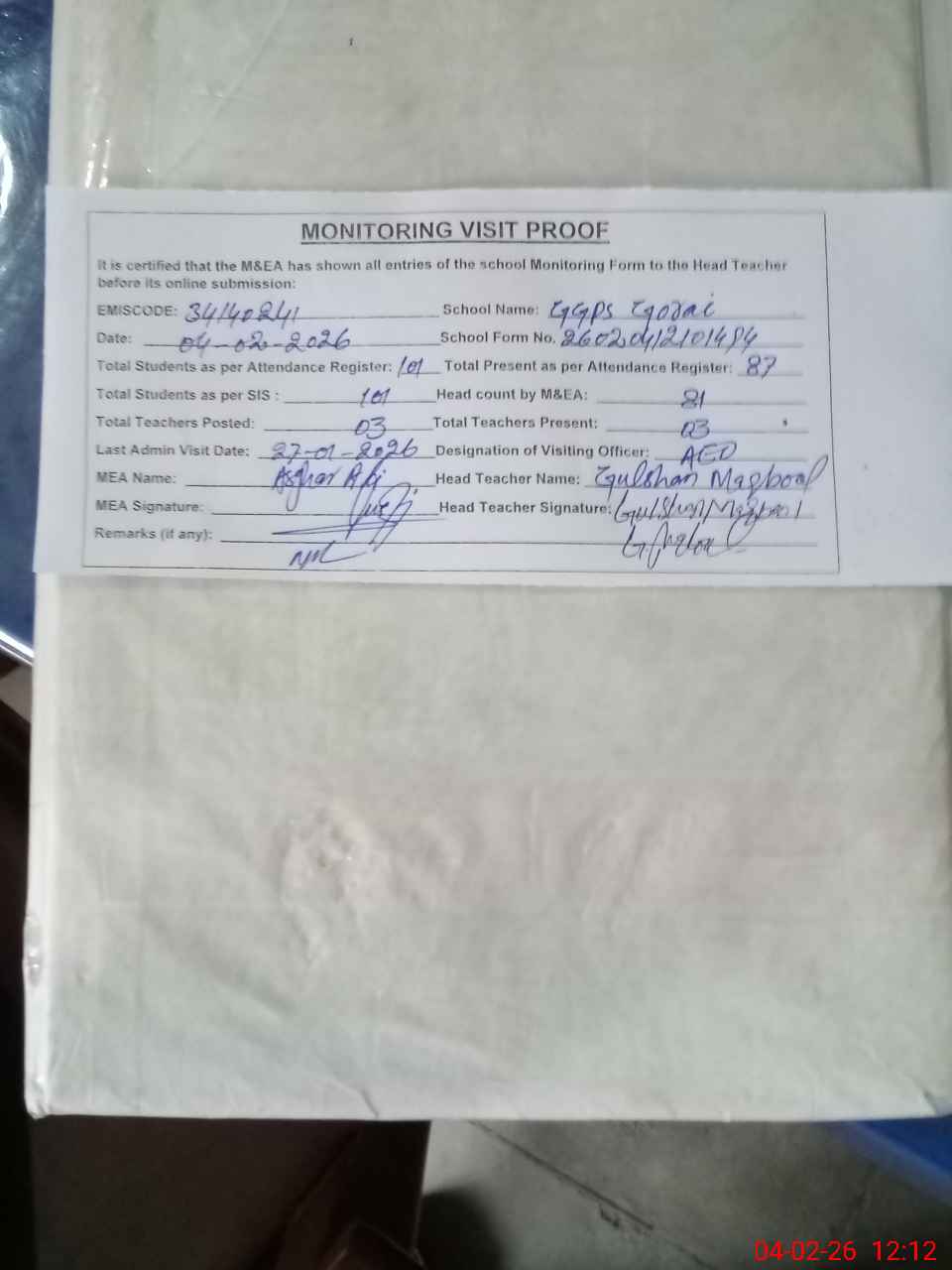 | Attendance Register | Head Teacher | MEA with School | Visit Proof |