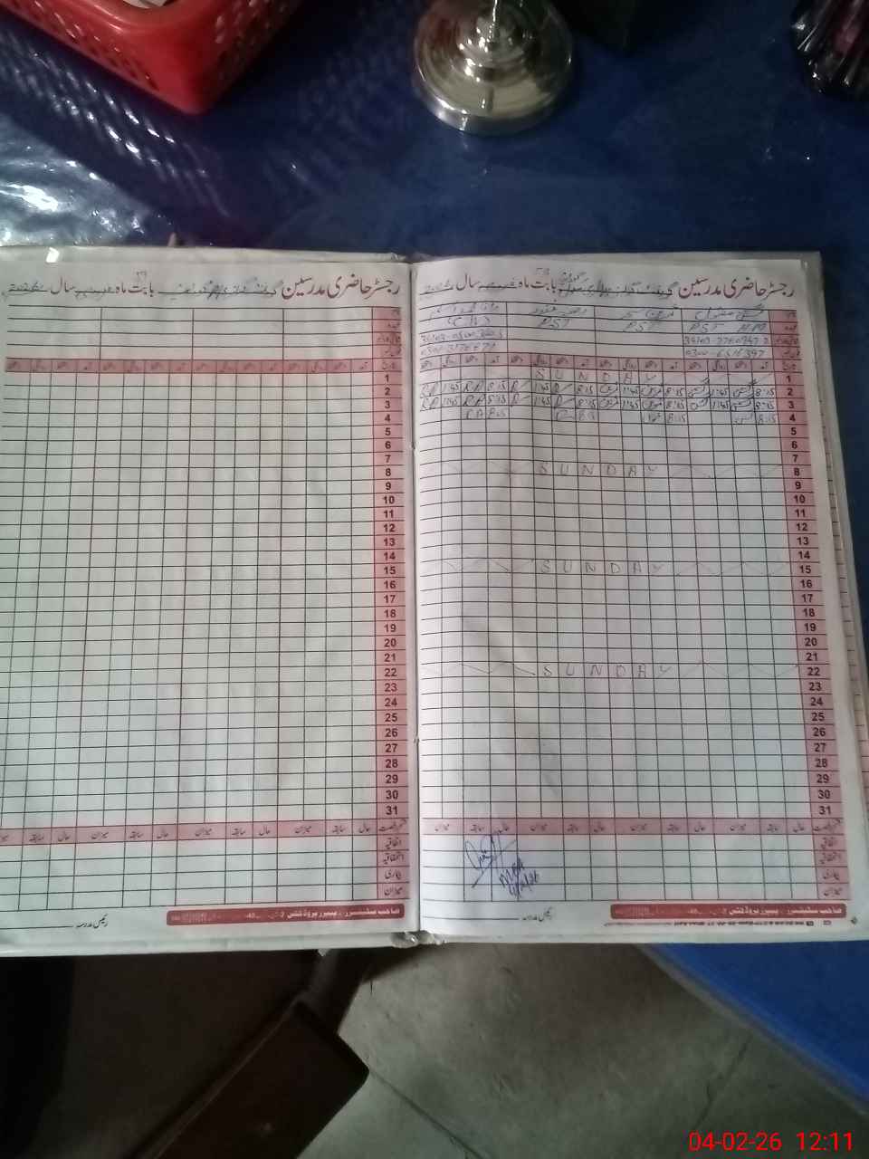 | CNIC | Full Name | Designation | R/C | Absence During Last Calender Month |