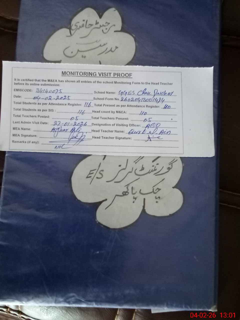 | Attendance Register | Head Teacher | MEA with School | Visit Proof |