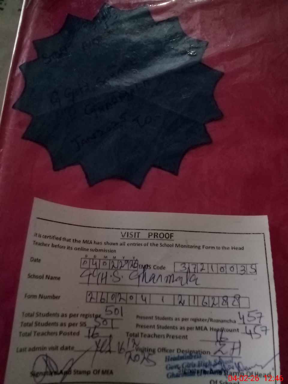 | Attendance Register | Head Teacher | MEA with School | Visit Proof |
