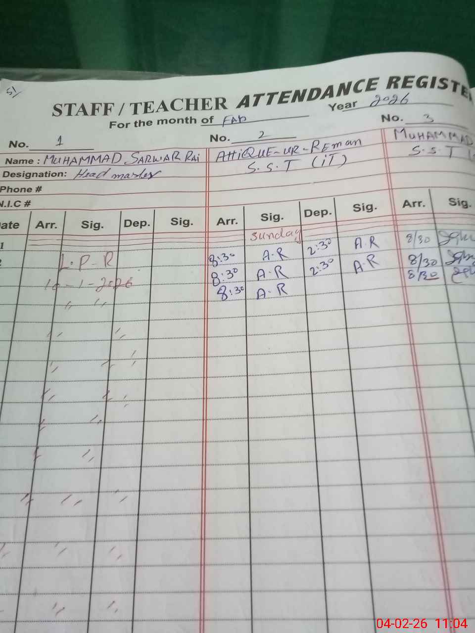 | CNIC | Full Name | Designation | R/C | Absence During Last Calender Month |