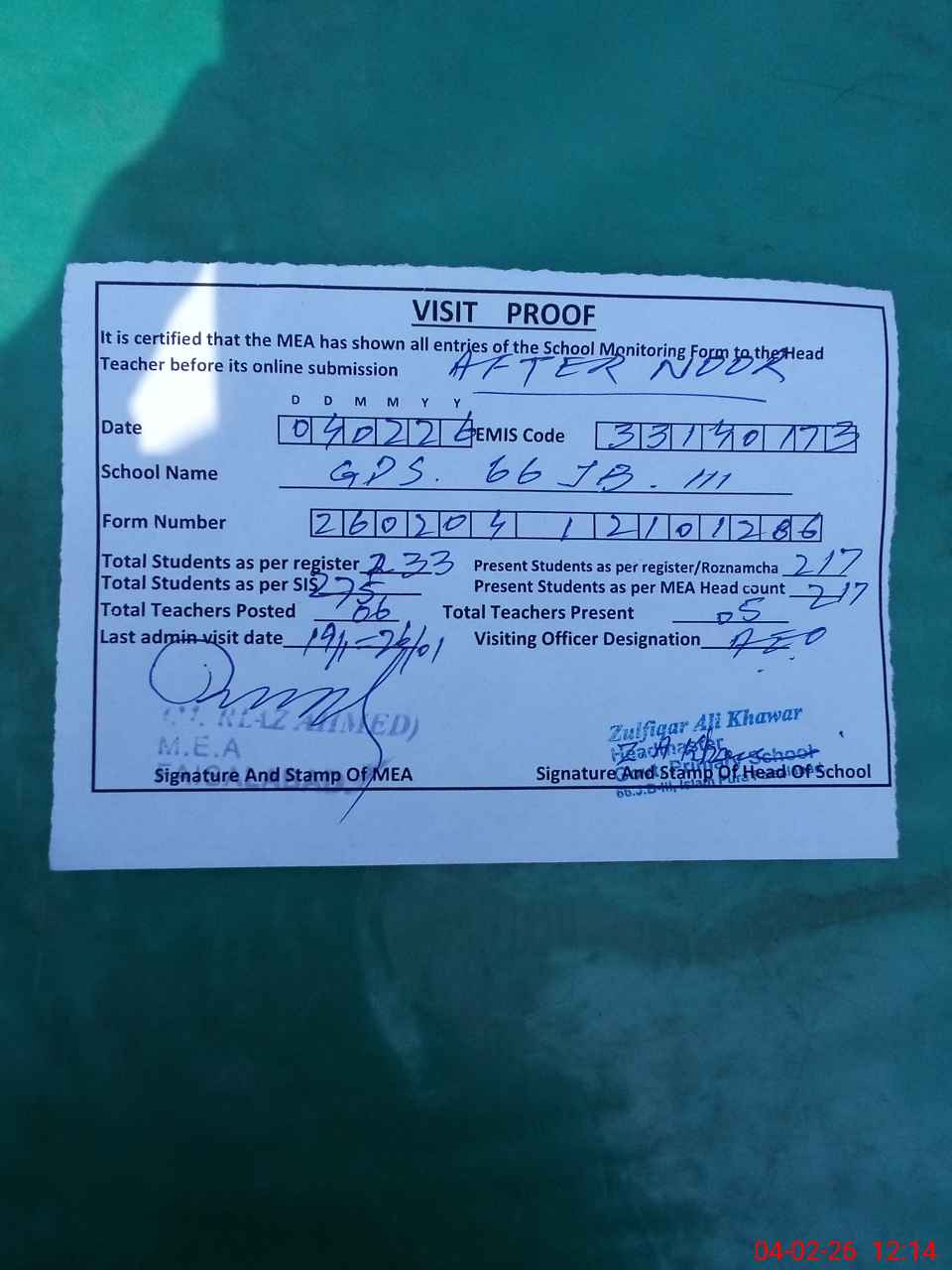 | Attendance Register | Head Teacher | MEA with School | Visit Proof |