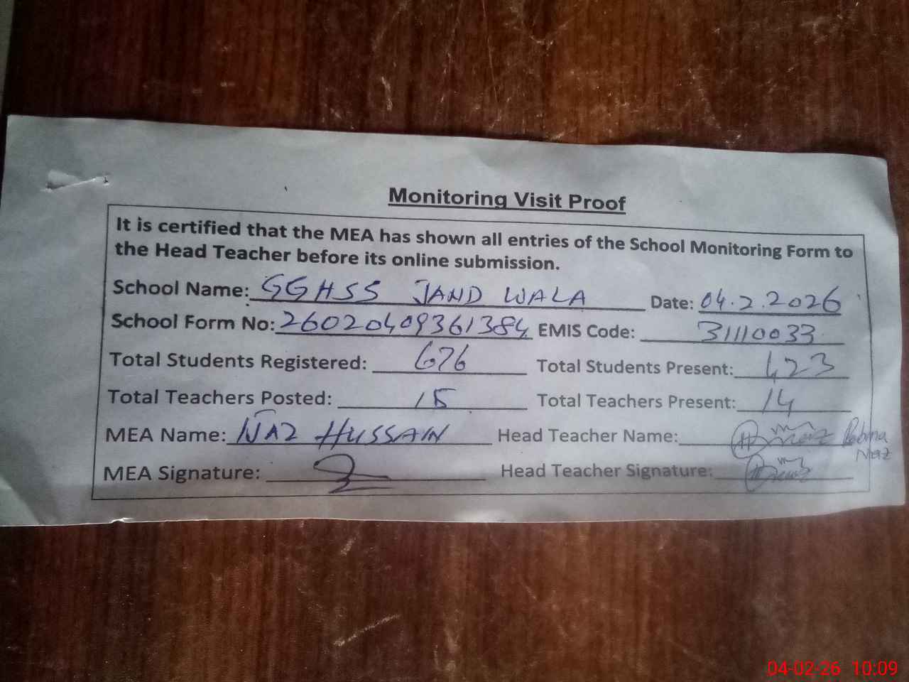 | EMIS Code: 31110033 | Name of School: GGHSS JAND WALA | |||