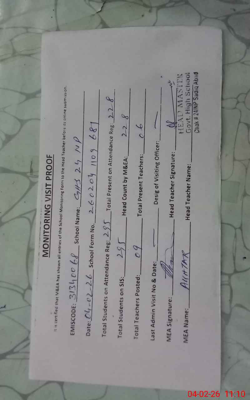 | EMIS Code: 31340068 | Name of School: GHS CHAK NO. 24 NP | |||