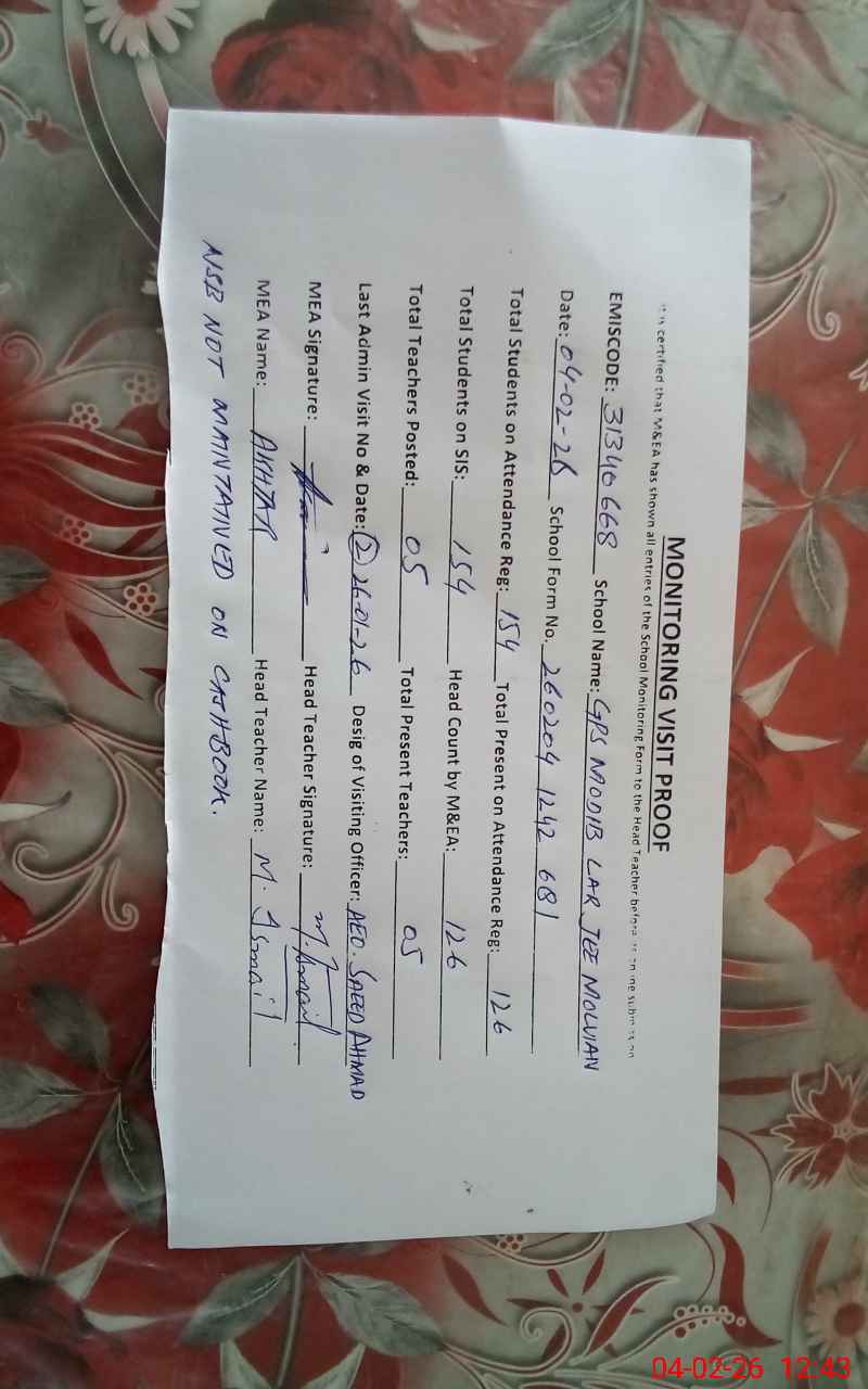 | EMIS Code: 31340668 | Name of School: GPS MOADIB LAR JEE MOULVIAN CHAK NO. 25 NP | |||
