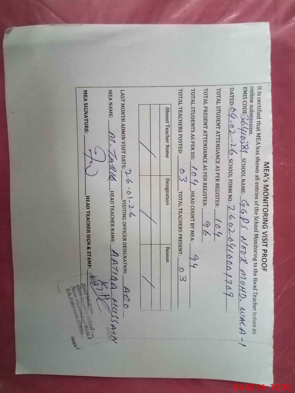 | Attendance Register | Head Teacher | MEA with School | Visit Proof |