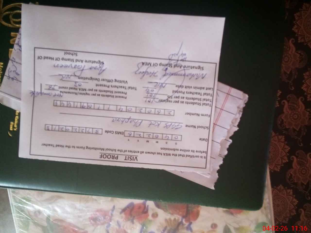 | Remarks (Use Separate Page if Required): Sir. When I reached for visit 1015 hrs Following students are not present in ECCE class but their presence on register. Muhammad Sohail Aman Ullah Umar Khan Noor Haram Muhammad Kamran. 4x students not register but sitting in only for head concern teacher not tell me about it. when I count show these students In Nursery class. picture are available Uzaima was present but on register absent Amina Shbeer on register present but absent. 3x students sitting in class Nursery of different classes. Harmain Fatima one class Janat 2nd Class Students cleaning of school Jharo/Toilet cleaning picture are available PST Teacher Mazhar not headteacher but interference during my visit and misbehave with me. please check and instruct him. | |||||