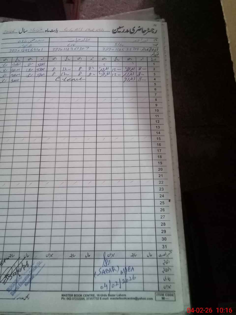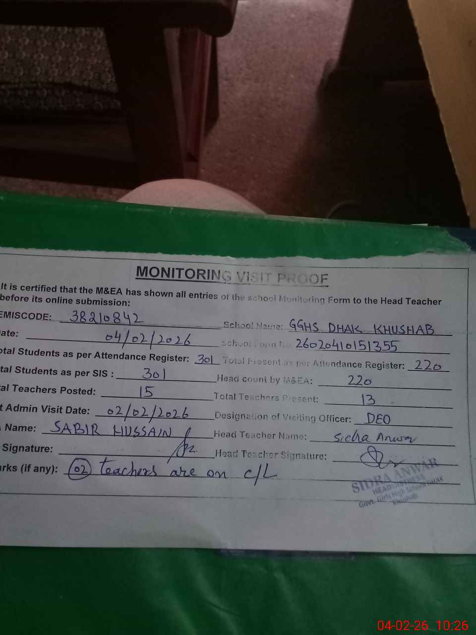 | Remarks (Use Separate Page if Required): no teacher absent total students on register 301 total students on SiS 301 last admin visit by DEO SE on 02 Feb 2026 | |||||