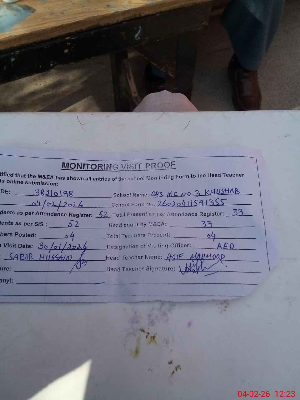 | Remarks (Use Separate Page if Required): no teacher absent total students on register 52 total students on SiS 52 Last admin visit by AEO on 30 Jan 2026 | |||||