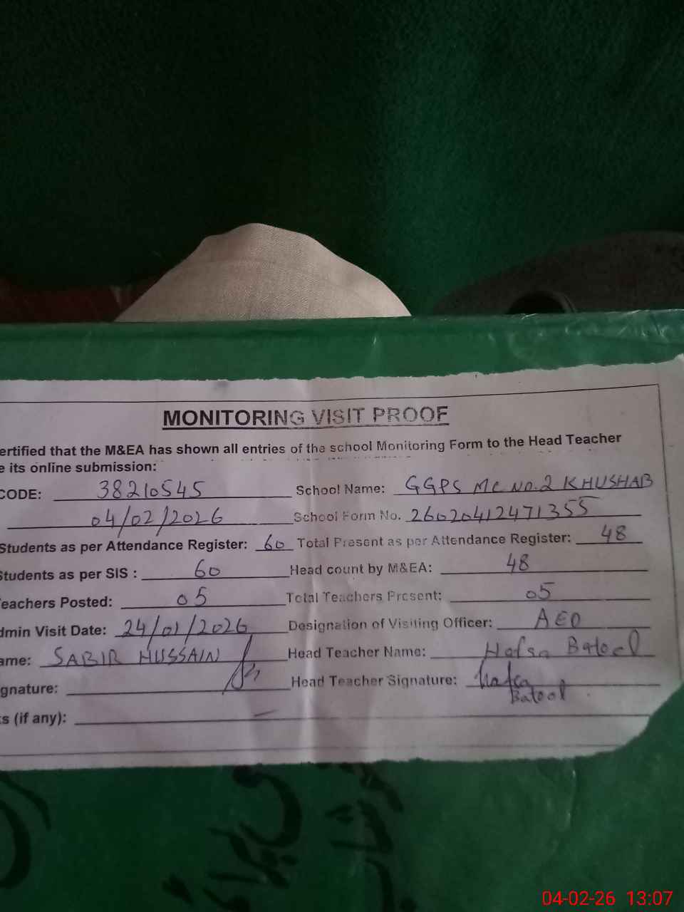| Remarks (Use Separate Page if Required): no teacher absent total students on register 60 total students on SiS 60 Last admin visit by AEO on 24 Jan 2026 | |||||