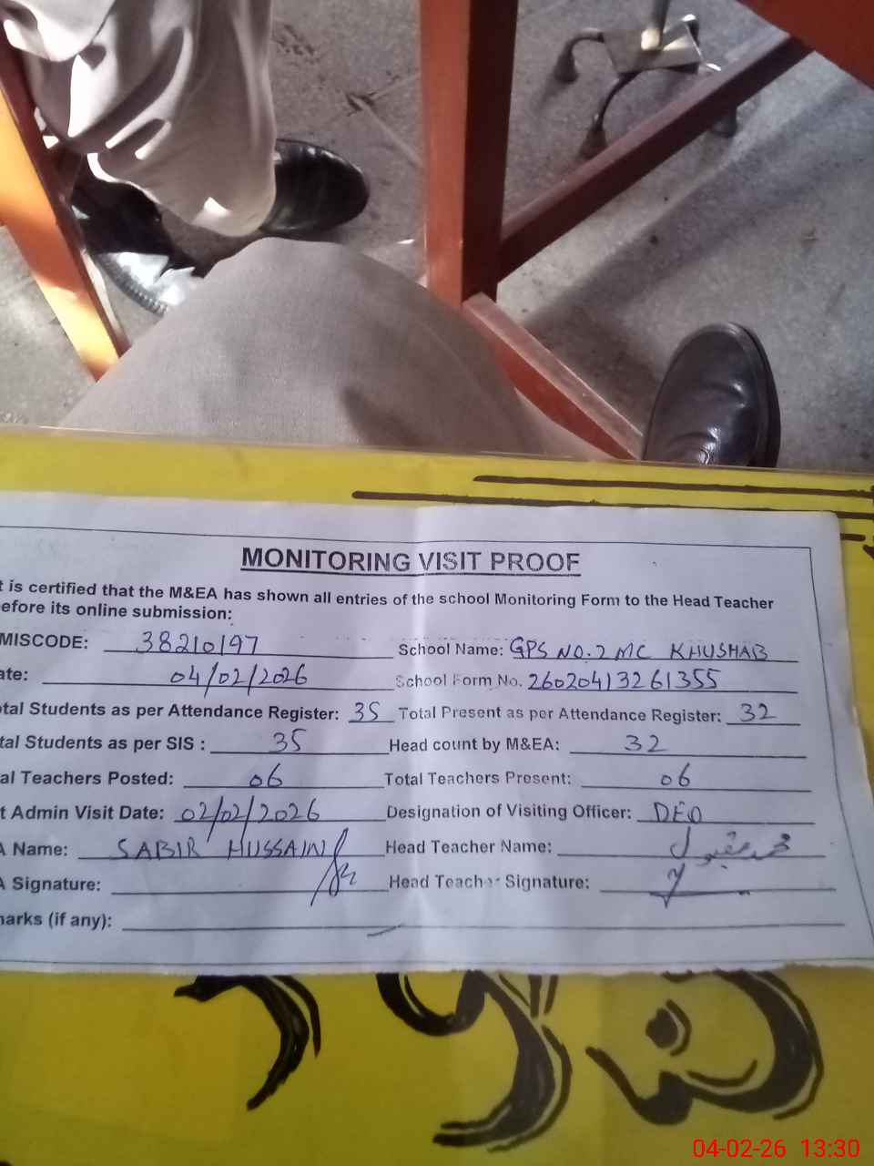 | Remarks (Use Separate Page if Required): no teacher absent total students on register 35 total students on SiS 35 last admin visit by DEO on 02 Feb 2026 | |||||